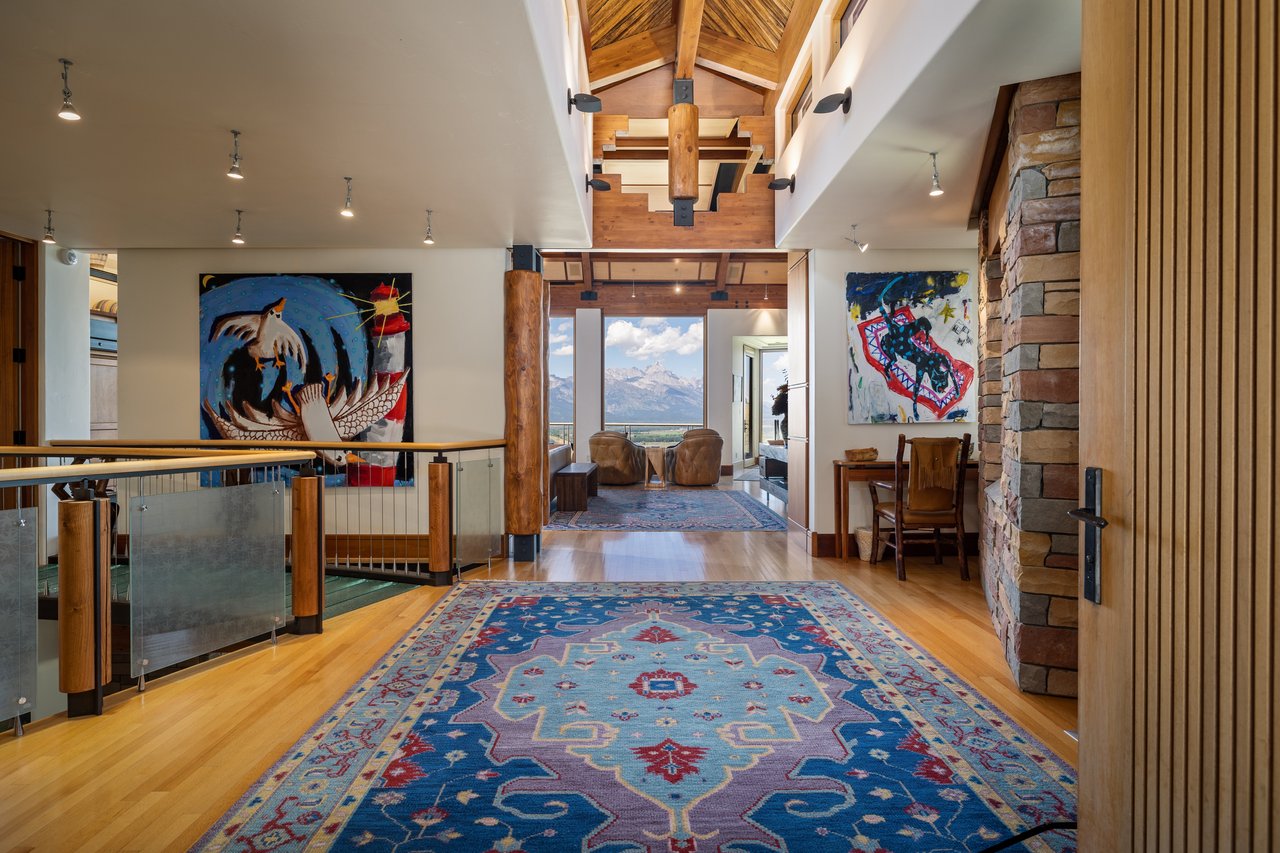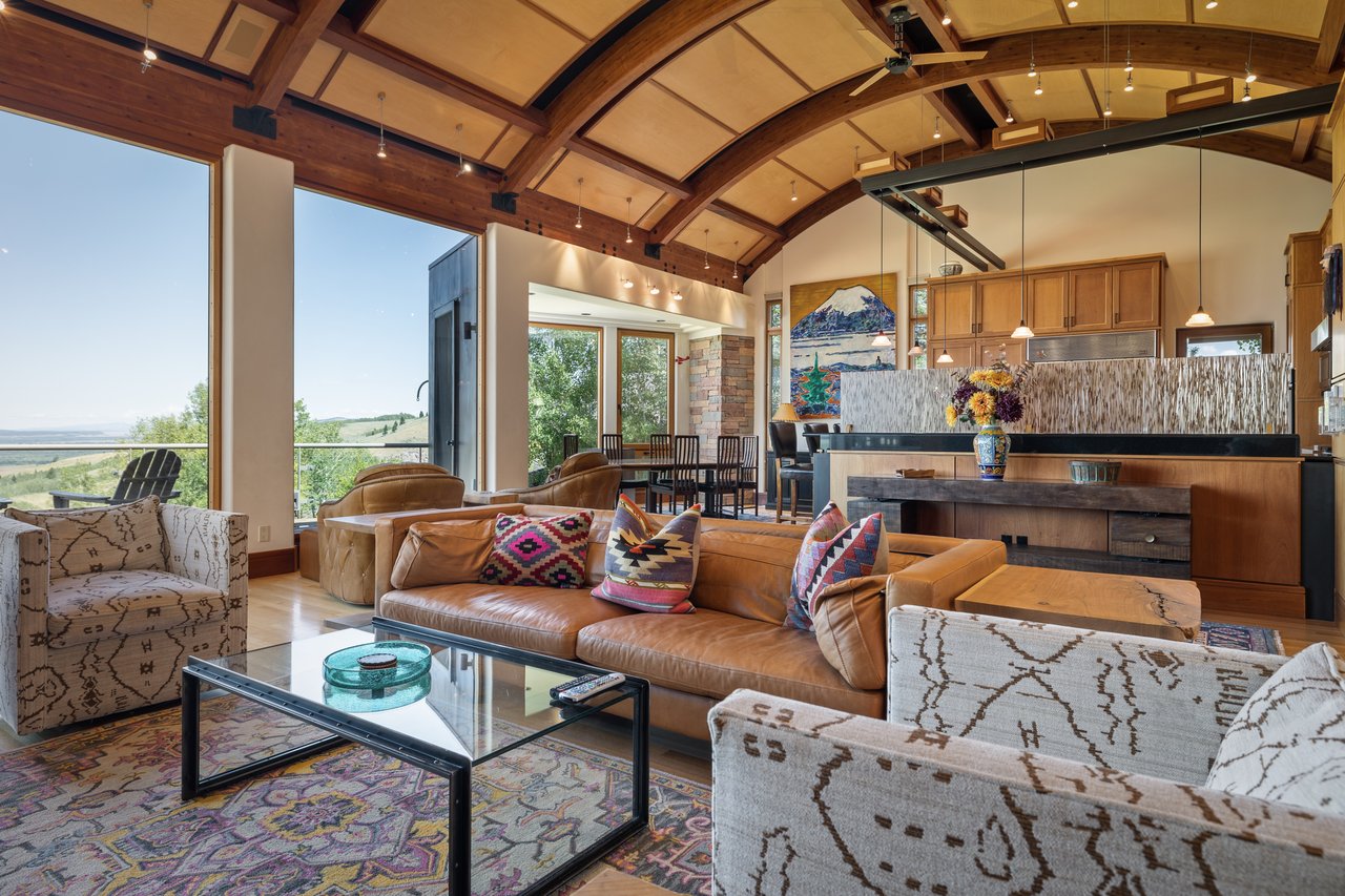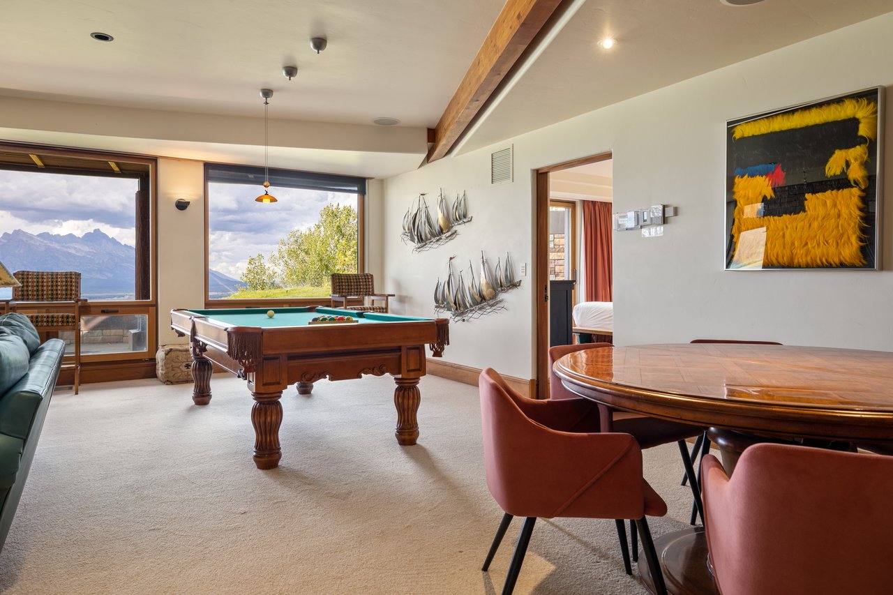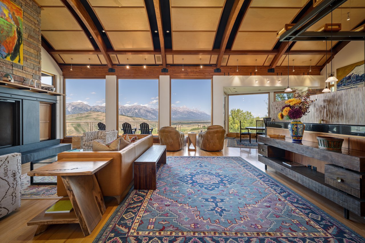 Privately situated along a tree-lined drive, this stunning Midcentury Modern/Western-inspired residence—known as the ''Trout House''—was custom-designed by Ward + Blake Architects to reflect the passions of its original owners. With nearly 5,000 sq ft of living space, the home features a dramatic vaulted great room, custom built-ins, and playful trout-themed design elements throughout. The spacious layout includes four ensuite bedrooms, including a luxurious primary suite accessed via a lighted glass bridge, offering floor-to-ceiling Teton views, a spa-like bath, and a custom walk-in closet.