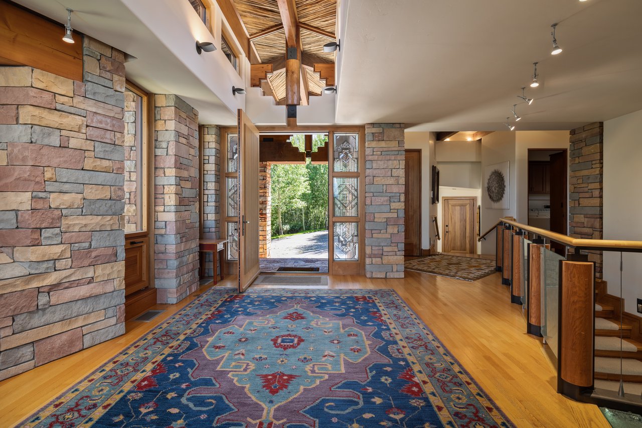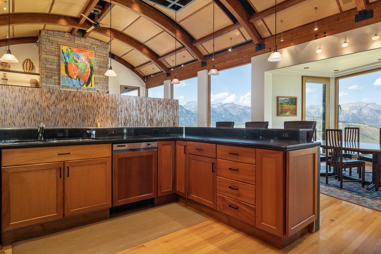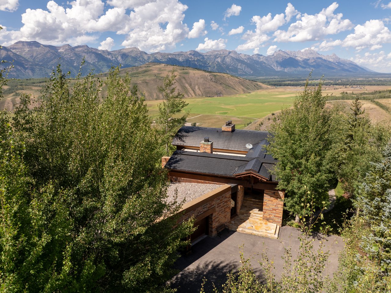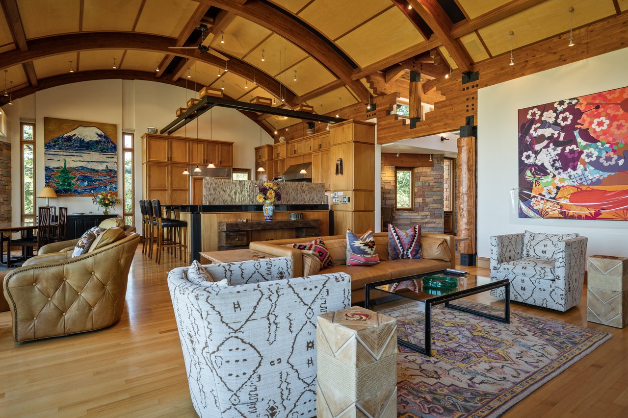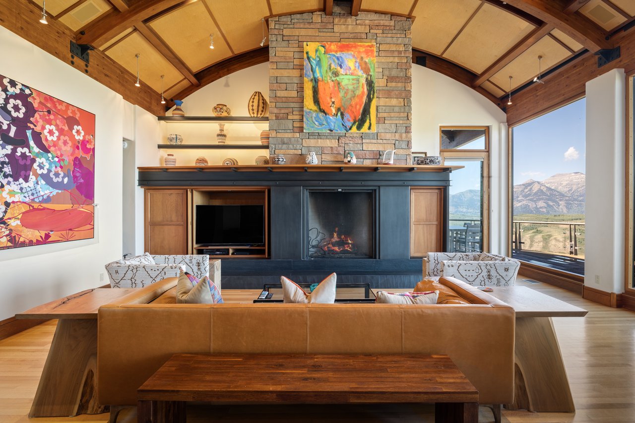 Privately situated along a tree-lined drive, this stunning Midcentury Modern/Western-inspired residence—known as the ''Trout House''—was custom-designed by Ward + Blake Architects to reflect the passions of its original owners. With nearly 5,000 sq ft of living space, the home features a dramatic vaulted great room, custom built-ins, and playful trout-themed design elements throughout. The spacious layout includes four ensuite bedrooms, including a luxurious primary suite accessed via a lighted glass bridge, offering floor-to-ceiling Teton views, a spa-like bath, and a custom walk-in closet.